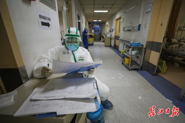 2020年2月24日,武汉红十字会医院9楼临时ICU病房,红会医院的护士孙亚正在记录患者的身体状况