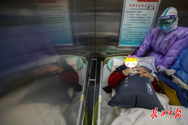 2020年2月28日,武汉红十字会医院7楼临时ICU病房,来自上海的护士田定远和同事一起护送一位新冠肺炎危重症患者去做肺部CT