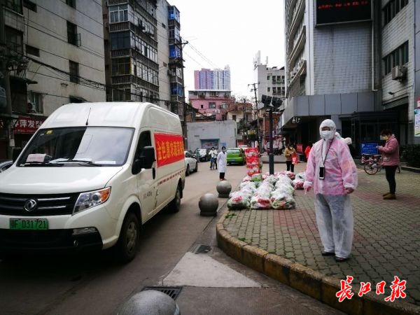 团购物资到达后,舒爱红和志愿者、网格员们一起卸货、搬运、分拣,再分别通知各小区和院落的团购负责人领菜。社区里大多老旧房屋没有电梯,舒爱红爬楼把菜送到高龄老人家门口。一些老人不会用手机支付,舒爱红就自己把钱先垫着。