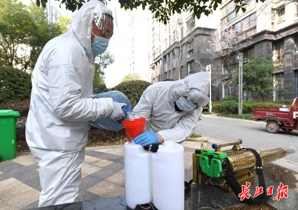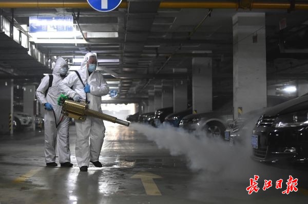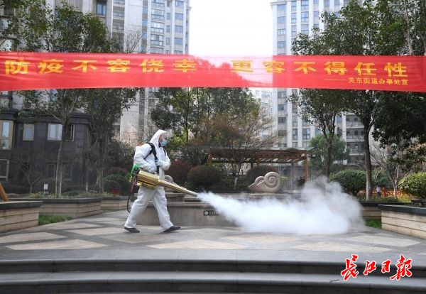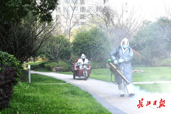 长江日报-长江网3月5日讯 3月5日,东湖高新区关东街道金地华公馆小区展开全面消杀,物业工作人员肩挎烟雾消杀器,对小区楼道、电梯、车库、广场等公共区域及垃圾收集转运站等设施喷洒消毒药物,并请来大型专业消毒车对社区路面进行消杀。据悉,这种大规模全面消杀行动自战“疫”以来,小区物业坚持每周一次全员行动。(记者高勇 摄影报道)