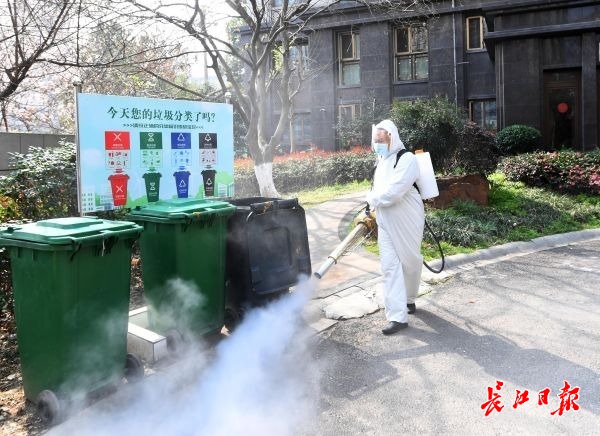 物业工作人员对公共区域及垃圾收集转运站等环卫设施喷洒消毒药物。记者高勇摄影