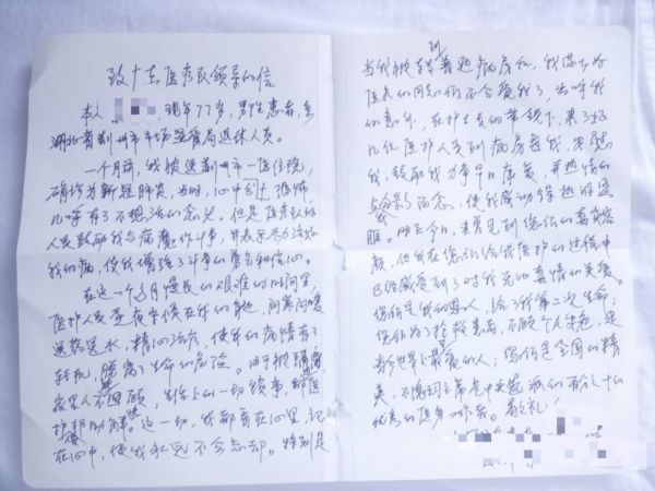 “在这一个月漫长时间里,医护人员昼夜守候在我身边,嘘寒问暖,送药送水,精心治疗,使我的病情有了转机,脱离了生命危险。由于我被隔离,家里不能来人照顾,生活上的一切锁事,都是由护理人员帮助解决,这一切,我都铭记在心里,我永远不会忘记。”老人写道。