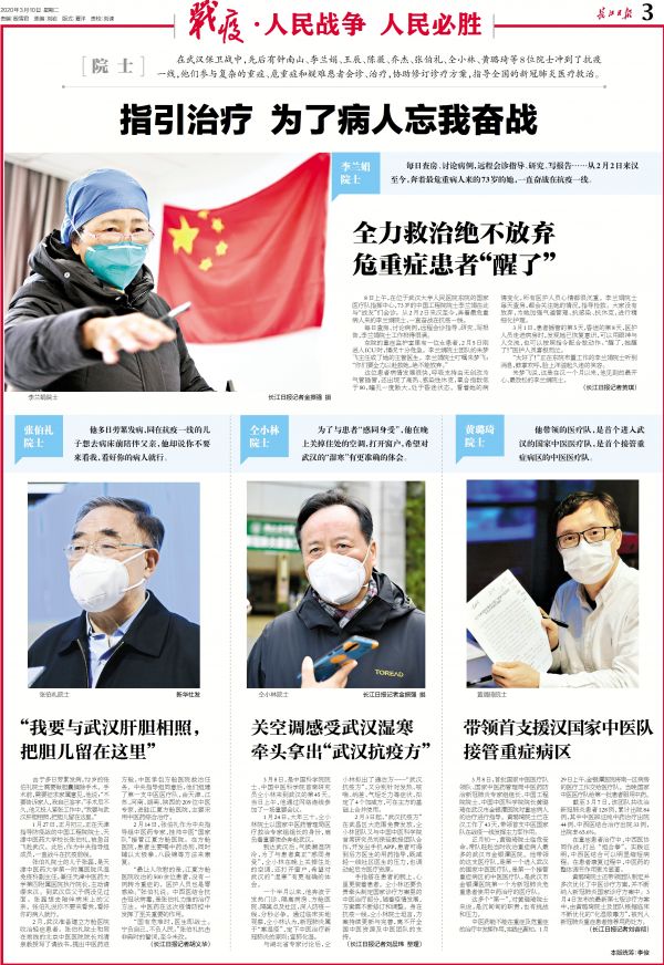 长江日报-长江网讯 在武汉保卫战中,先后有钟南山、李兰娟、王辰、陈薇、乔杰、张伯礼、仝小林、黄璐琦等8位院士冲到了抗疫一线,他们参与复杂的重症、危重症和疑难患者会诊、治疗,协助修订诊疗方案,指导全国的新冠肺炎医疗救治。