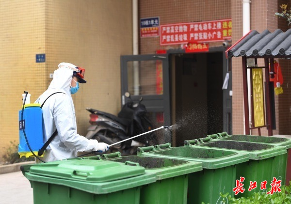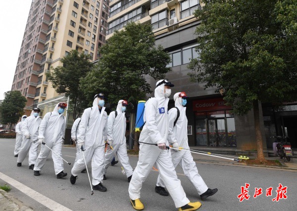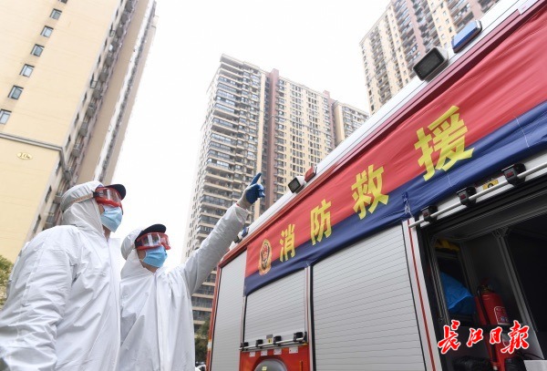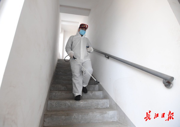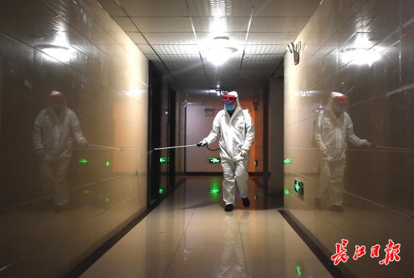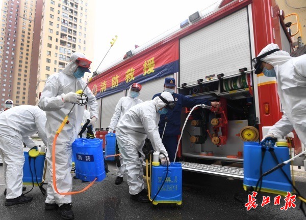 长江日报-长江网3月11日讯 3月11日上午,东湖高新区消防救援大队大学园站119党员突击队,将装有消毒水的消防车开进关东街道祥和雅居社区进行消杀作业,10名消防救援队员全副武装背负消毒喷雾器对小区的5栋10个单元的楼道逐层消杀。他们将在本月内对关东街道的40余个小区进行全面消杀。(记者高勇 摄影报道)