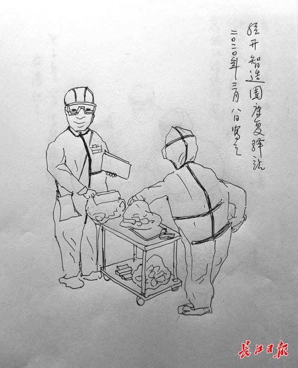 长江日报-长江网3月11日讯(记者李冀 通讯员胡深博)“这是我手绘的一组速写漫画,送给你们!”近日,协和医院西院金艳护士收到一份特殊的礼,一位新冠肺炎治愈者在“经开智造园康复驿站”接受隔离观察时,绘制了一组暖萌暖萌的漫画,记录下这特殊的时刻。