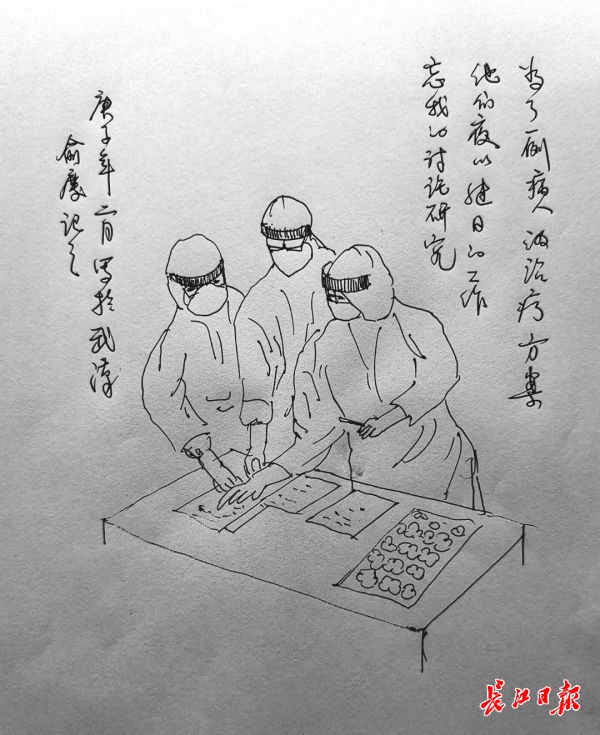 这组漫画是以“最美的白衣战士”为主题,人物形象突出,刻画了一线医务工作者的艰辛与不易,两侧还写有“你们是时代最可爱的人”。手绘漫画的是小庆,之前在广东从事绘画教学工作。2月27日,他从汉南区人民医院出院,来到“经开智造园康复驿站”接受隔离观察,医护人员的悉心照料让小庆深受感动,于是他拿起画笔记录下温暖的瞬间。