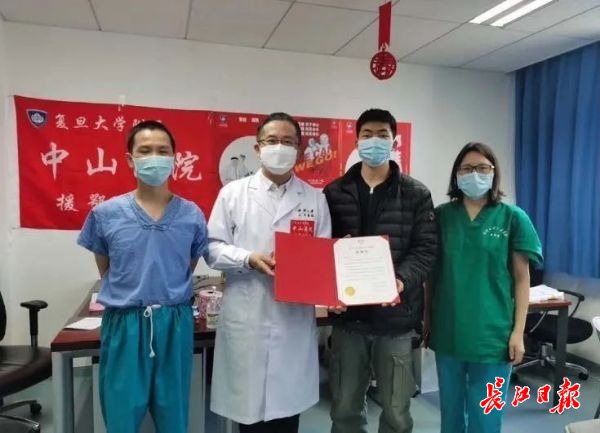 长江日报-长江网3月13日讯(记者伍伟)3月12日,在武汉大学人民医院东院区,复旦大学附属中山医院援鄂医疗队领队朱畴文向志愿者甘俊超颁授中山医院院长樊嘉院士签发的感谢状,感谢甘俊超拍摄下“医生陪患者欣赏落日”的照片,记录了医患之间的温情瞬间。同一天,另一个好消息也传来:一起看落日余晖的87岁老先生已经可以下床!