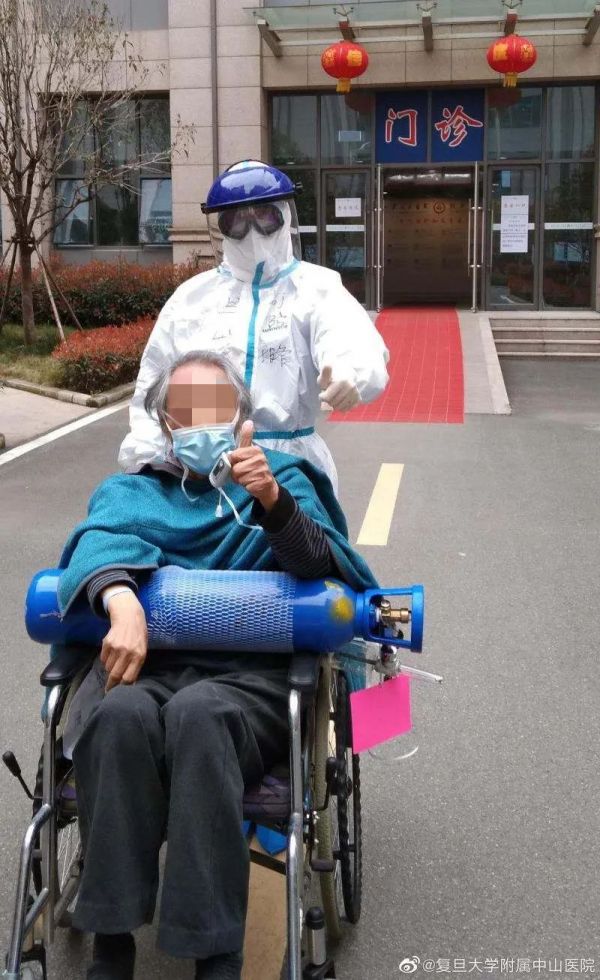 图为老先生竖起大拇指 复旦大学附属中山医院供图