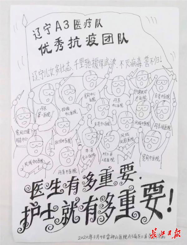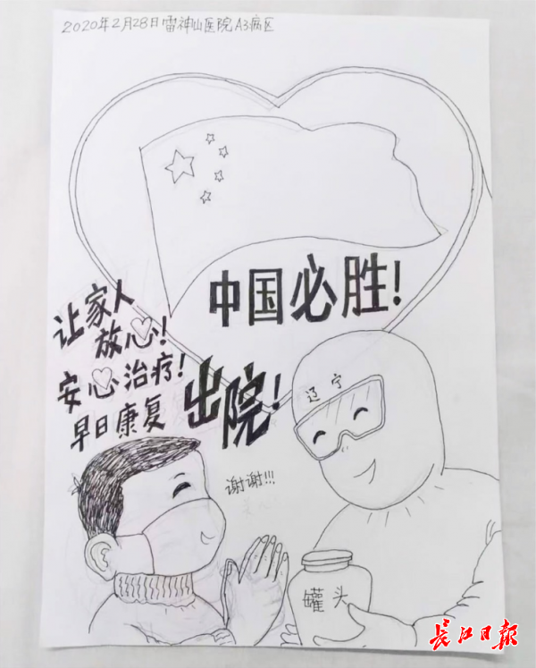 长江日报-长江网3月16日讯(记者汪洋)3月15日,58岁的李宗祥从雷神山医院康复出院。临行前,他为悉心照顾自己的辽宁医疗队队员送上一份特殊的礼物——自己住院期间画的13幅漫画。