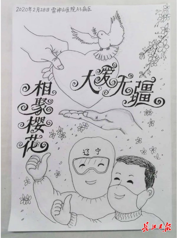 李宗祥住在雷神山医院A3病区,医护人员除了正常的治疗,还照顾他的一日三餐,给他送来新鲜的水果,陪他说话,让他有了战胜病魔的信心。“我感觉身体状况一天天变好,和大家朝夕相处的这些日子里,点点滴滴都让我感动。”李宗祥是一名美工,他决定用画将所见所闻记录下来。