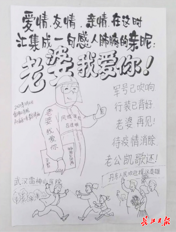 李宗祥有幅主题是“胜利凯歌”的漫画,他画下了与他朝夕相处的医护人员:孟娜、景颖、姜作勇、张辉……漫画下方,是武汉市民在不久的将来欢送战“疫”英雄回家。“这也是我的美好心愿,期待快点到来。”李宗祥说。