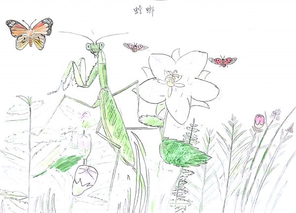 姜博扬先查阅有关昆虫书籍,熟记昆虫的形态、习性、生存环境等知识后,再找来彩色铅笔和画纸,认真地勾勒起来。绘制昆虫集第一幅画是一只螳螂,诞生得有点艰难,他足足用了3个小时。聂女士拍下这幅画发给一位搞美术的朋友看,朋友说,“隐逸草丛中的昆虫世界,热闹有爱,形态不一,清新动人”。