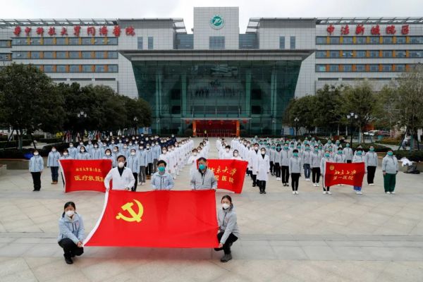 华中科技大学同济医院中法新城院区,北京大学第一医院、北京大学人民医院、北京大学第三医院医疗队的党员和入党积极分子代表重温入党誓词 新华社发