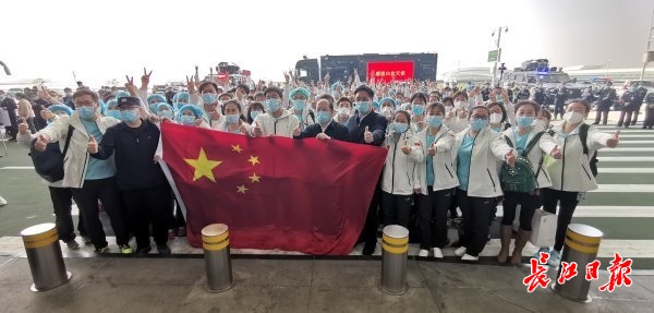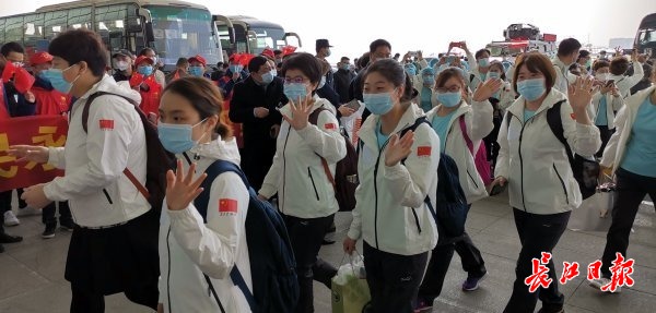 天津医疗队一队领队陆伟眼含着热泪说,“我们在寒冷中来到武汉,在樱花盛开时节离开武汉,每位医疗队员都难以割舍这种情谊。武汉是英雄的城市,武汉人民是伟大的人民,我们也祝武汉保卫战早一天胜利结束,希望武汉人民永远健康平安。”