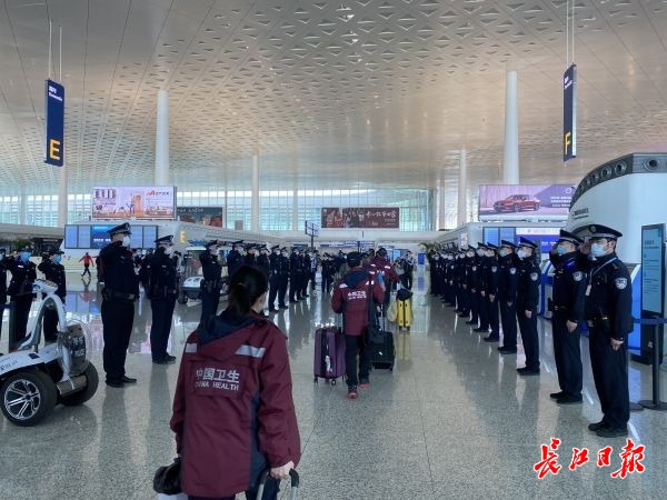 海南医疗队队员、海南医学院第一附属医院主治医师程少文说,当踏入候机大厅时,看见两旁的警察向他们齐刷刷敬礼时,自己差点哭了。