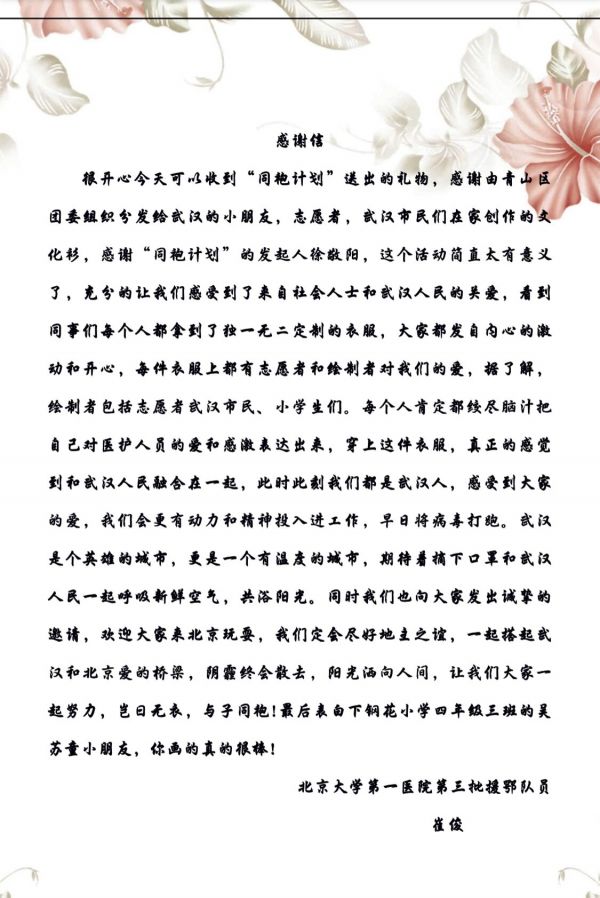长江日报-长江网3月17日讯 “武汉是个英雄的城市,更是一个有温度的城市。”3月17日,北京大学第一医院护士小姐姐崔俊将一封信送到了青山区钢花小学师生手中。此前,钢花小学师生手绘76件文化衫,送到了援汉医护人员手中表示感谢。