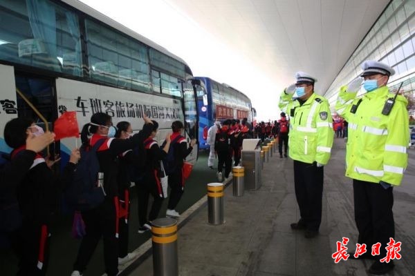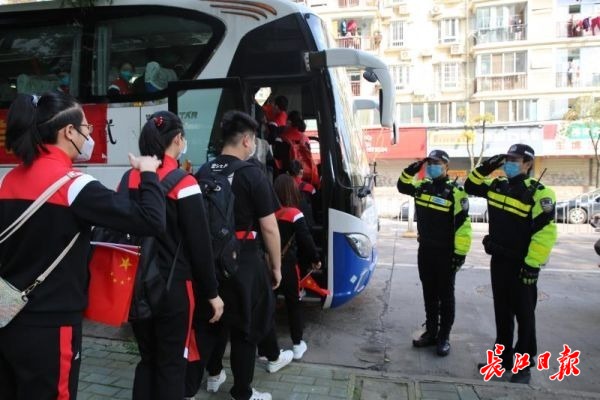 据市公安交管局相关负责人介绍,返程护航中,市公安交管局指挥中心统一智慧调控交通信号,全线绿灯放行;武汉交警全程警车开道,警灯闪烁,并由汉警快骑全程护送。车辆通过时,全体民警、辅警面向车辆立正敬礼,目送车辆离开。