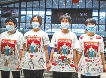 湖南援汉医疗队的白衣天使们穿着武汉小朋友为她们手绘的T恤合影留念 。长江日报记者任勇 摄