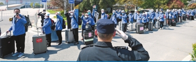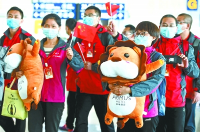 中央指导组、湖北省、武汉市等集中为宁夏、新疆生产建设兵团、上海、广东等9支医疗队,共计300多名队员代表送行。