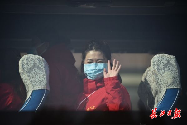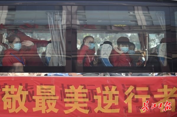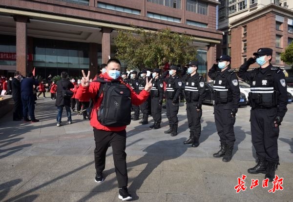 “武汉感谢您,武汉感谢您!”从酒店大门至大巴的路上,驻地保障人员、酒店工作人员、执勤警察站列两侧,鼓掌、敬礼、挥手,表达感激。
