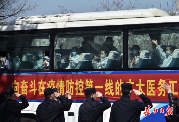 民警们敬礼送别即将返程的云南援鄂医疗队队员。记者 郭良朔 摄