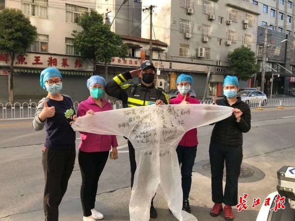 长江日报-长江网3月18日讯(记者魏娜 通讯员王美慧)江岸交通大队汉警快骑队员彭茂在值勤时收到一件珍贵礼物——有山西医疗队全体队员签名的防护服。