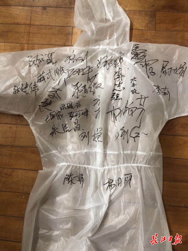 令人意外的是,彭茂还收到了一份特殊的礼物——一件写满了队员名字的全新防护服。白衣天使们说:“这是我们山西医疗队所有队员的签名,也是我们一点点心意,谢谢你们这段时间的付出!”彭茂接过防护服,虽然很轻,但心里却被沉甸甸的情谊填满:“防护服上的每一个字都值得被铭记,他们是英雄的名字,更是历史的见证。这是我们武汉交警收到的最贵重礼物。”