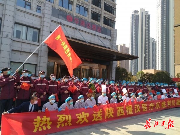 长江日报-长江网3月20日讯(记者韩玮)今天上午,位于青山区建设三路的华美达酒店门口,137名陕西第一批援汉医疗队队员整装待发,青山区为他们举行了简短而热烈的欢送仪式。下午2时许,他们搭乘航班返回西安。