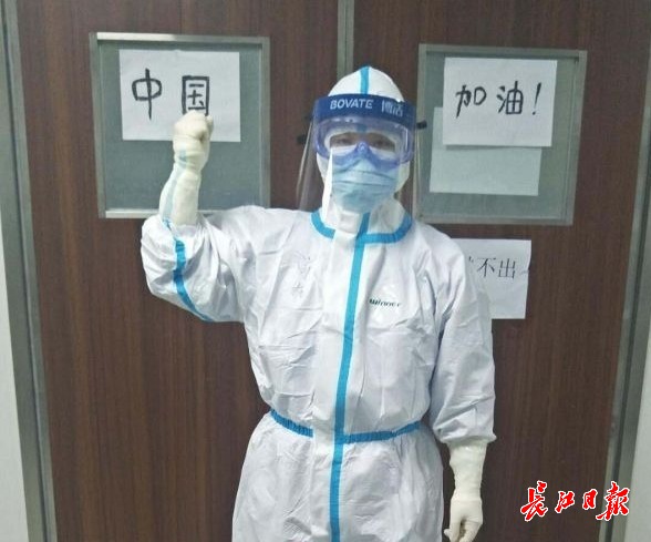肖爽为自己和患者鼓劲加油 河北援鄂第一批医疗队 供图