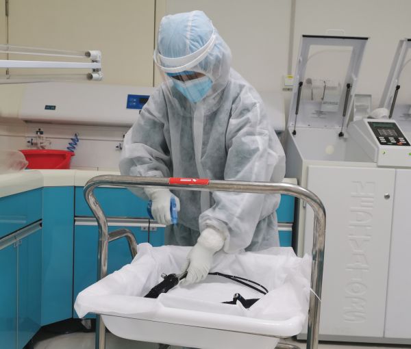 仁医楼4楼,主管护师向嵘细致地穿戴好防护装备,走进医疗污物专用电梯,直上13楼。13楼ICU外走廊尽头,一条纤支镜经过第一道消毒,打包完毕,放在转运推车上。向嵘与ICU护士做了交接,把这条纤支镜推回内镜中心的盥洗室。