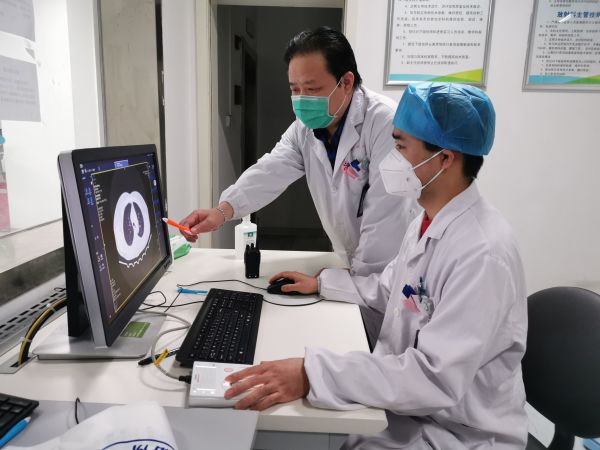 50岁的放射科医生李政旻双眼泛黄,正专注地查看患者CT片,这一天,有50余名患者从外院转入,值夜班的他负责为这些患者做出影像学诊断,一名患者近500帧镜头,一晚上要看20000多帧。