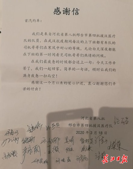 长江日报-长江网3月22日讯 “在武汉战疫期间,每次上下班都有车队司机哥哥们在寒风中耐心等候,感谢这一个月以来的暖心护送。”近日,负责武昌区交通保障的网约车司机们收到了一封来自河北省第八批医疗队的感谢信,让司机们红了眼眶,“医护人员太不容易了,应该是武汉人民感谢她们,没想到她们会给我们写感谢信。”