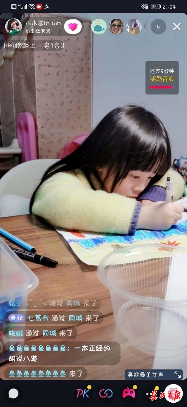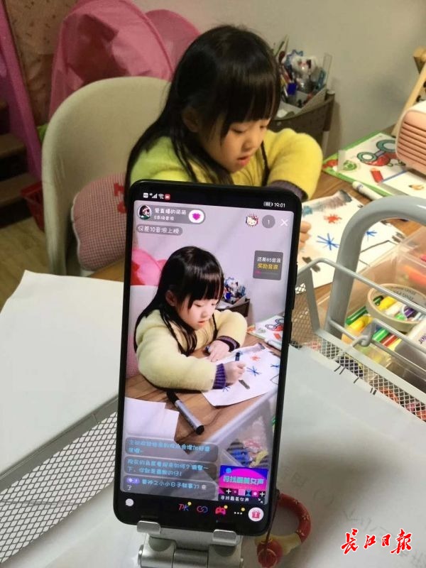 妈妈李女士是她的直播助理,帮她拍摄并提醒她和网友互动。做直播,是5岁萌萌宅家两个月里的新爱好,“这个想法还是受她爸爸的影响。”妈妈李女士告诉长江日报-长江网记者,萌萌的爸爸是一名高中英语老师,疫情期间,每天通过网络为学生授课答疑,“妈妈,我也想做直播教大家画画。”看到爸爸每天在书房直播,萌萌也想模仿爸爸。
