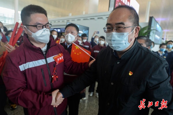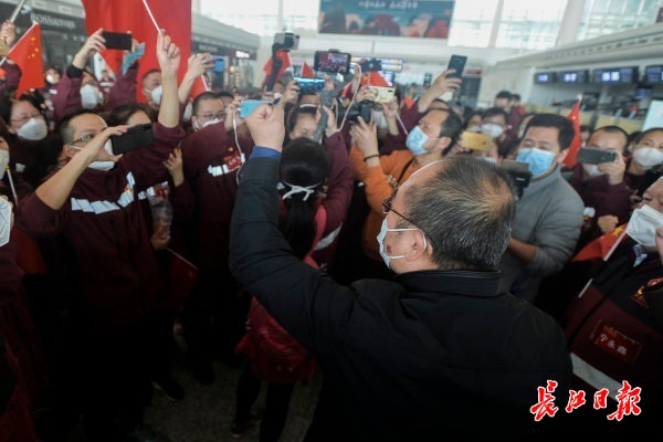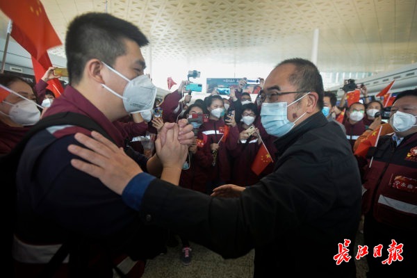 福建省第一批援鄂医疗队宁永鑫激动地上前拥抱,哽咽地说“谢谢张院长来送我们”。张院长轻轻拍拍宁永鑫的背,“我要谢谢你们才是,真的谢谢你们!”“谢谢大家在我们最危难的时候,拉了我们一把。你们是拯救地球的英雄,你们都是超人啊。”张定宇眼眶湿润地说着,向福建第一批援鄂白衣战士深深鞠躬。话音刚落,福建医疗队员们迫不及待回复“我爱你,张院长!”