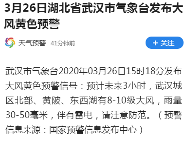 今天15时18分,武汉市气象台发布大风黄色预警。