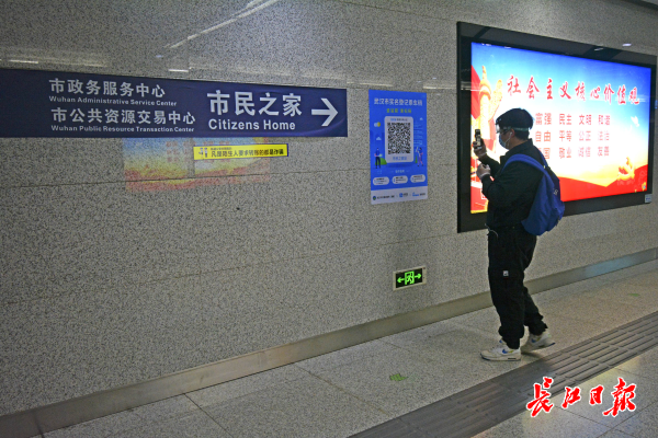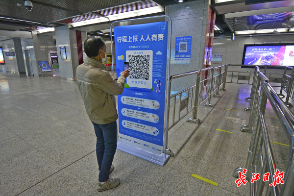 2020年3月28日早上6时30分,市民之家地铁站,一位乘客扫码后进站候车。 记者杨涛 摄