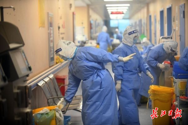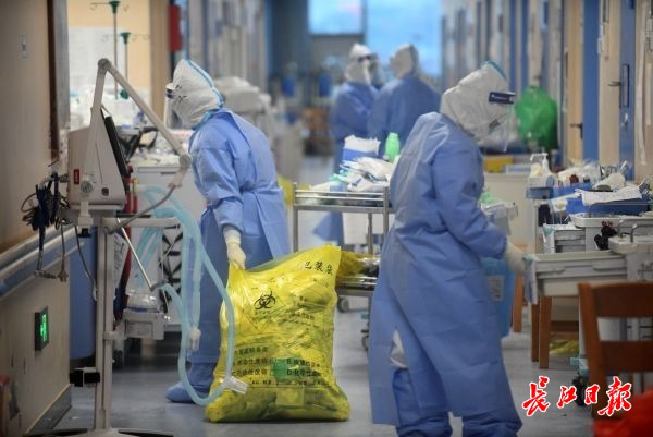 长江日报-长江网3月30日讯 29日下午,华中科技大学同济医院光谷院区ICU病房,医护人员正在清理空置病房里的医疗器械和生活垃圾,并进行消毒工作。按照国家卫健委的整体部署,自3月26日起,该院区所有在院患者已陆续转至中法新城院区,由来自北京的6支国家医疗队和同济医院集中收治。(记者苗剑 摄)