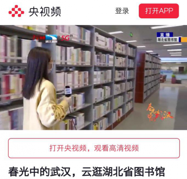 1904年,湖北省图书馆诞生了,它的创办人就是张之洞。2012年,湖北省图书馆新馆落成,成为荆楚地区的新文化地标之一。3月30日上午10点半,直播镜头瞄准了这座“百年图书馆”。馆外的绿荫下,嫩叶经春雨洗礼,葱茏新碧焕发满园生机。直播镜头中,省图书馆窗明几净,随着镜头步入103000平方米的宏伟楼宇,阅览838万册精妙绝伦的馆藏。据介绍,场馆内外每日循环消杀,精益求精确保不会遗漏疫情防控的每一处细节。直播间里,网友们纷纷评论,“大疫之下,书香不辍”“希望书籍给人以安慰和鼓励”。