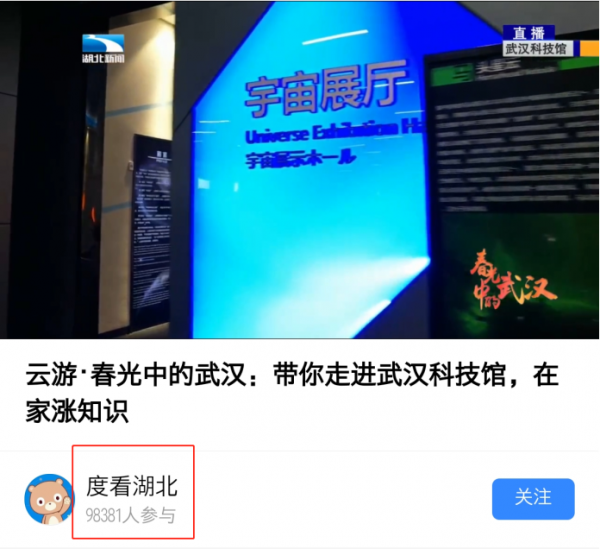 长江日报-长江网3月31日讯(记者黄丽娟 匡志达)为让更多宅家网友切实感受科学与自然魅力,3月31日“云游·春光中的武汉”带大家云游武汉科技馆,与科技对话,体验智慧之光,探索自然科学的奥秘。经不完全统计,3月31日直播累积总观看人数939.6万人次。