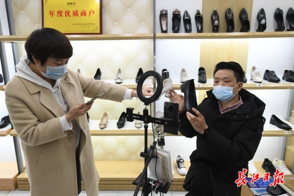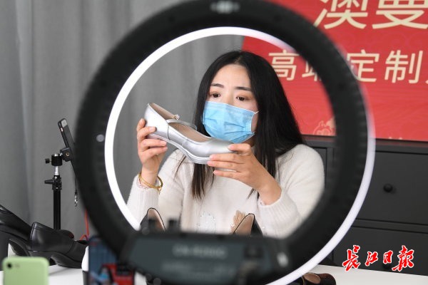 在汉口北鞋业皮具城里主播吴芳正在为商户直播新款皮鞋。