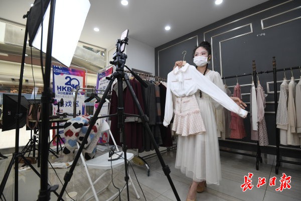长江日报-长江网4月1日讯 4月1日,在汉口北国际商品交易中心看到,服装、鞋业、酒店用品等30多个市场的商户相继复工开始营业,商户采购也逐步开始上升。除了实体市场外,店铺的老板们开始亲自上阵开始对着手机卖货。服装、食品、鞋业、二手车等市场经营户通过市场引进的50多家产业互联网平台、电商平台和直播平台,将自己的商品销售到各地。(记者詹松 摄影报道)