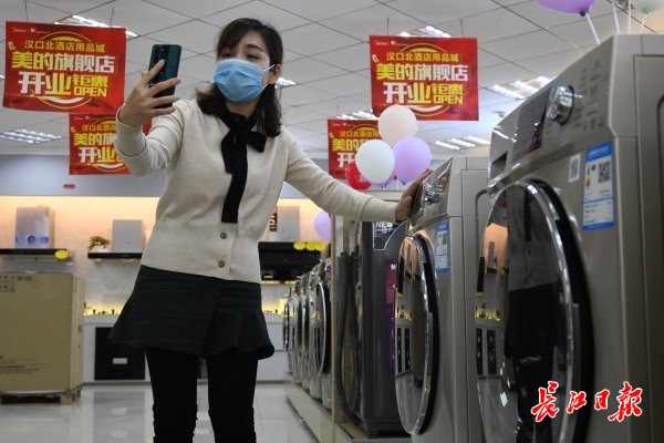 武汉汉口北美的旗舰店的店长雷桂珠正在与消费者互动,介绍自己经营的带高温烘干消毒功能的滚筒洗衣机。