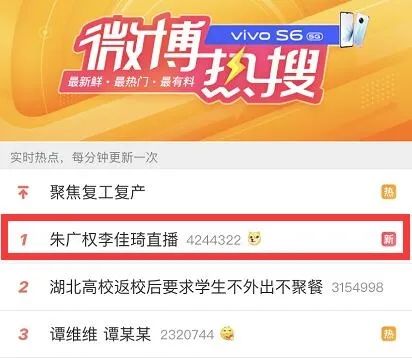 微博话题#朱广权李佳琦直播#阅读量突破3.3亿,迅速登上热搜第一位,持续霸榜4小时以上。