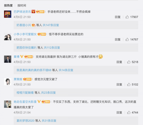 担任首场直播“带货官”的是央视新闻主播朱广权+带货达人李佳琦组成的“小朱配琦”组合,虽然疫情期间两人不能同场,但通过“连麦”进行的隔空“云直播”依然引发了网友为湖北“拼单”的热情: