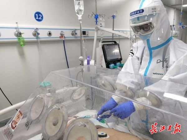 4月2日,在防护罩的保护下,市一医院医疗队护士为患者进行吸痰操作 受访者提供