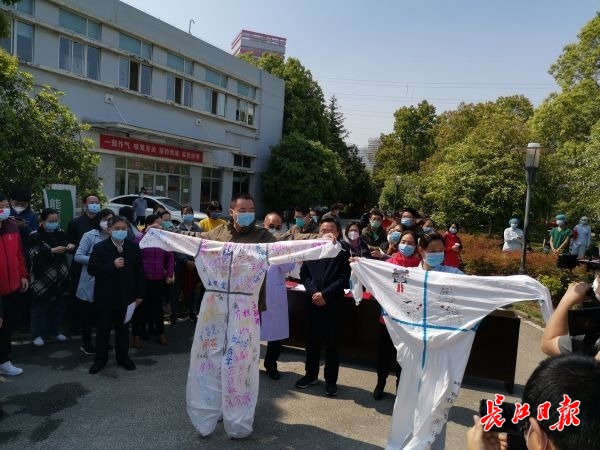 为纪念双方战斗情谊,金银潭医院重症监护室医护人员将自己的姓名签在一件新防护服上,赠送给江苏医疗队。