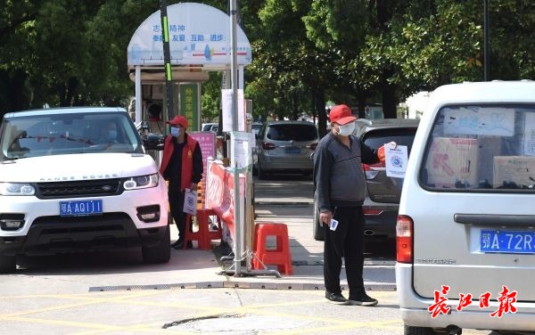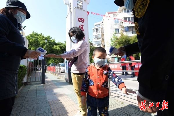 来自东西湖区人民法院、常青童梦幼儿园的下沉党员志愿者与物业人员一起,仍坚守在疫情防控各个岗位,对出入人员进行严格体温检测、健康码扫描,严防外来输入性风险,优化车辆出入管理办法。出入居民非常配合,均自觉排队接受扫码通行。(记者刘斌 摄影报道)