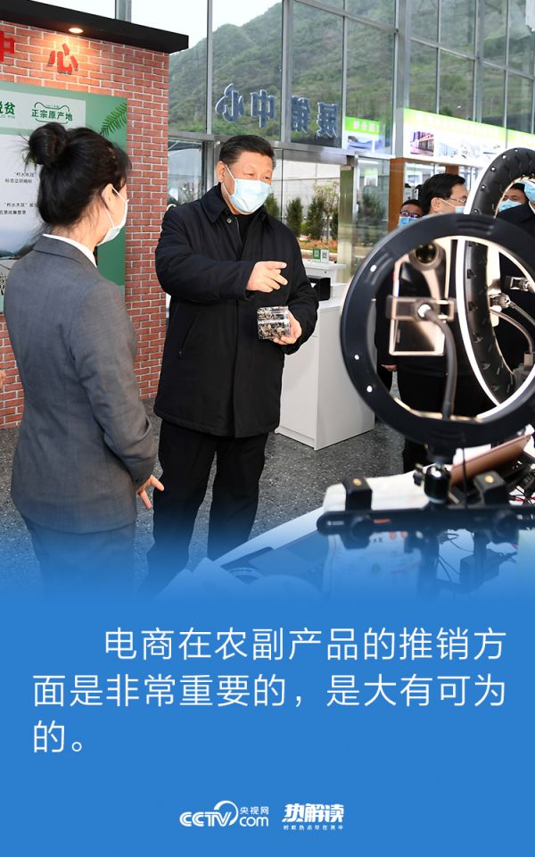 “电商在农副产品的推销方面是非常重要的,是大有可为的。”直播平台前,习近平总书记同正在做网上直播卖货准备工作的村民们聊了起来,并点赞农村电商。