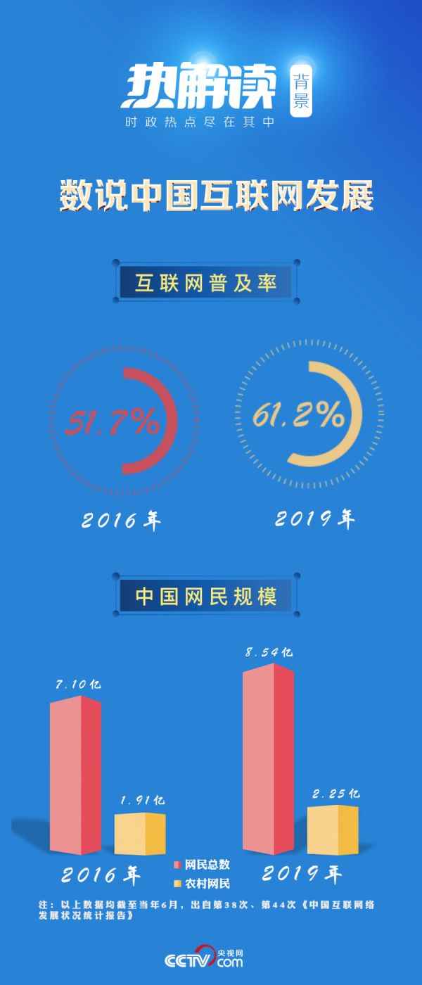 《中国互联网络发展状况统计报告》显示,2016年到2019年,互联网普及率从51.7%提升至61.2%,网民数量增加逾1亿,其中约3400万人来自农村。