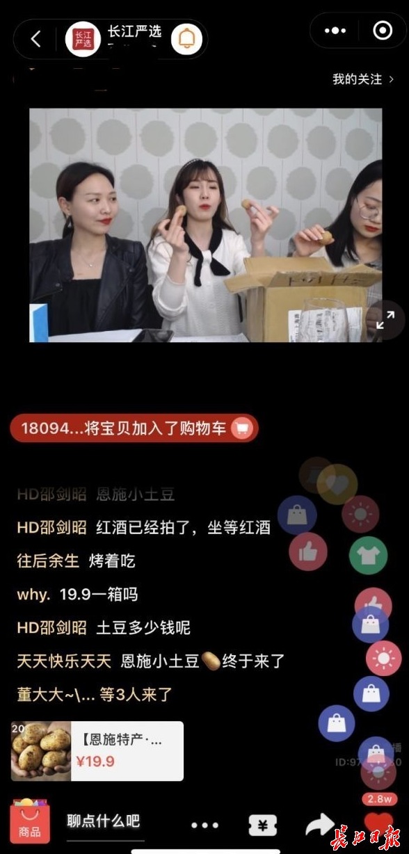 恩施腊肉腊肠、恩施小土豆、湖北名茶、亲蜂堂秦岭洋槐蜜、秭归伦晚脐橙、宜昌黄桃罐头、扬子江老字号糕点……一大批湖北特产登录平台,长江日报-长江网记者和两名主播也来了一场2个小时的“买买买”带货直播。